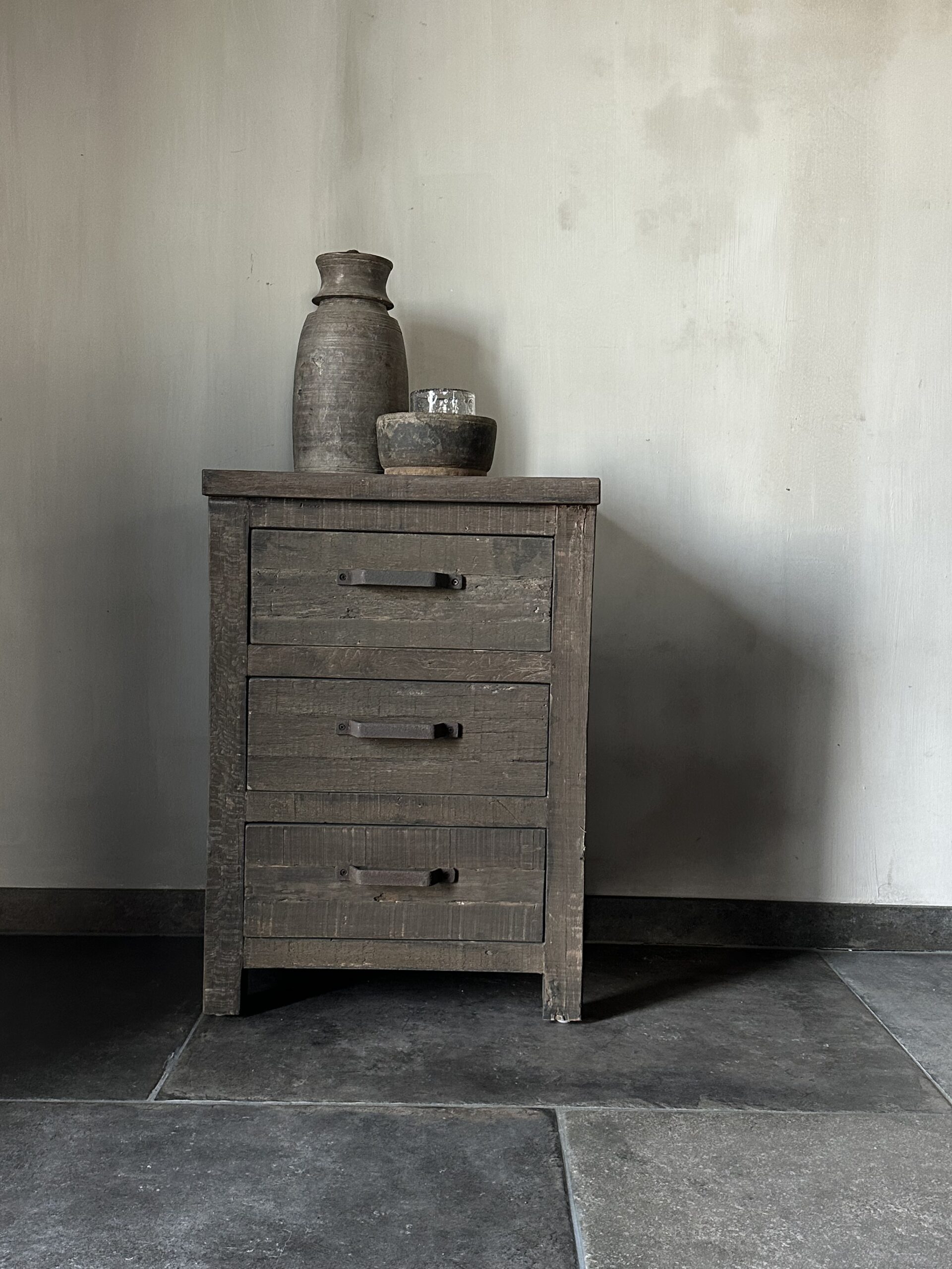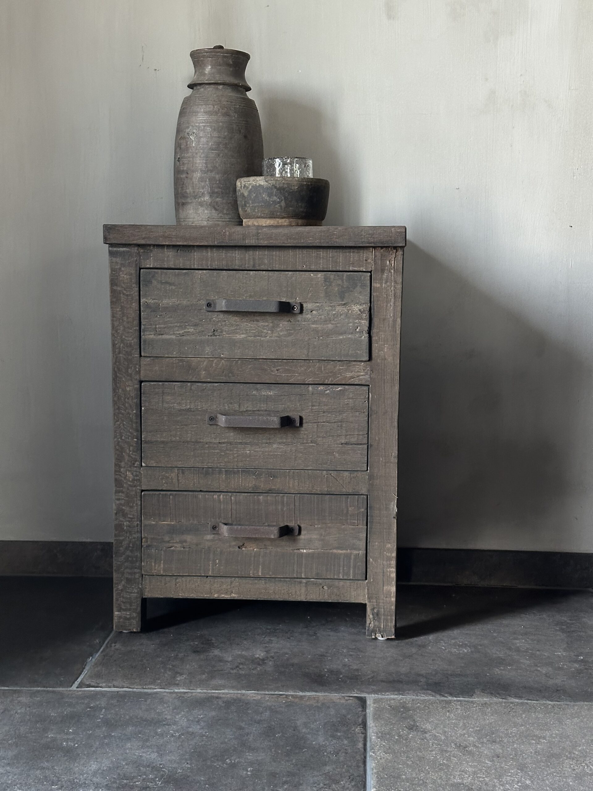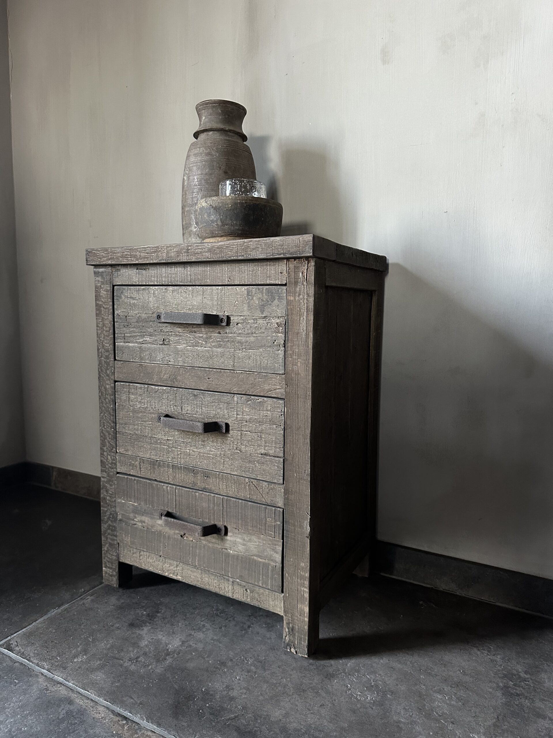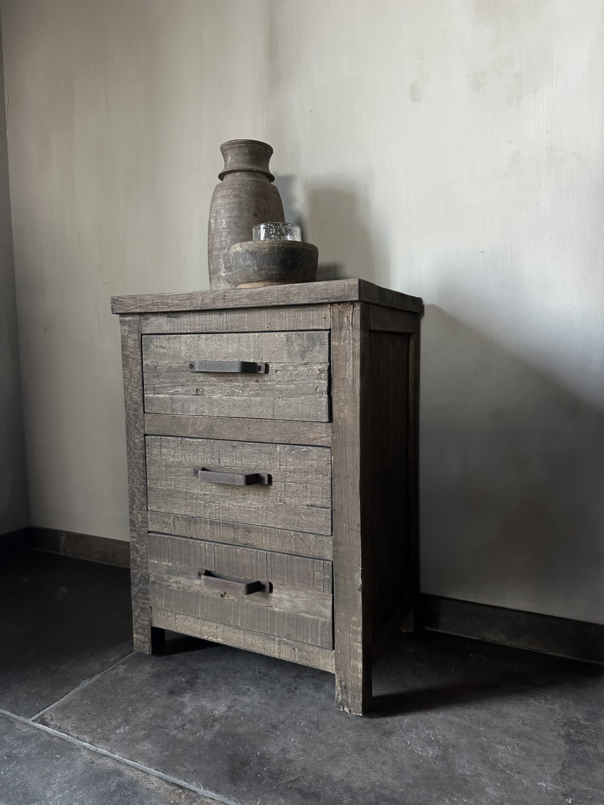 Dit ladekastje heeft 3 lades met een stoere roest handvat als extra detail. Ook zeer geschikt om te gebruiken als nachtkastje.