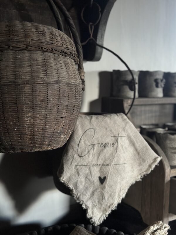 Shabby doek met de tekst: Geniet- meer niet!
