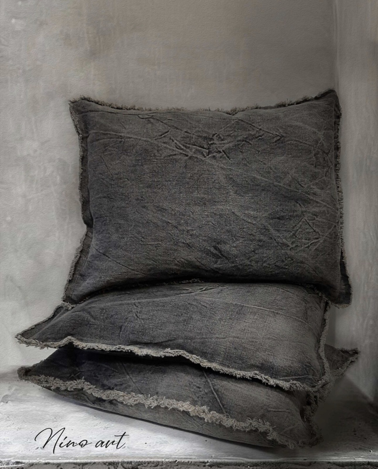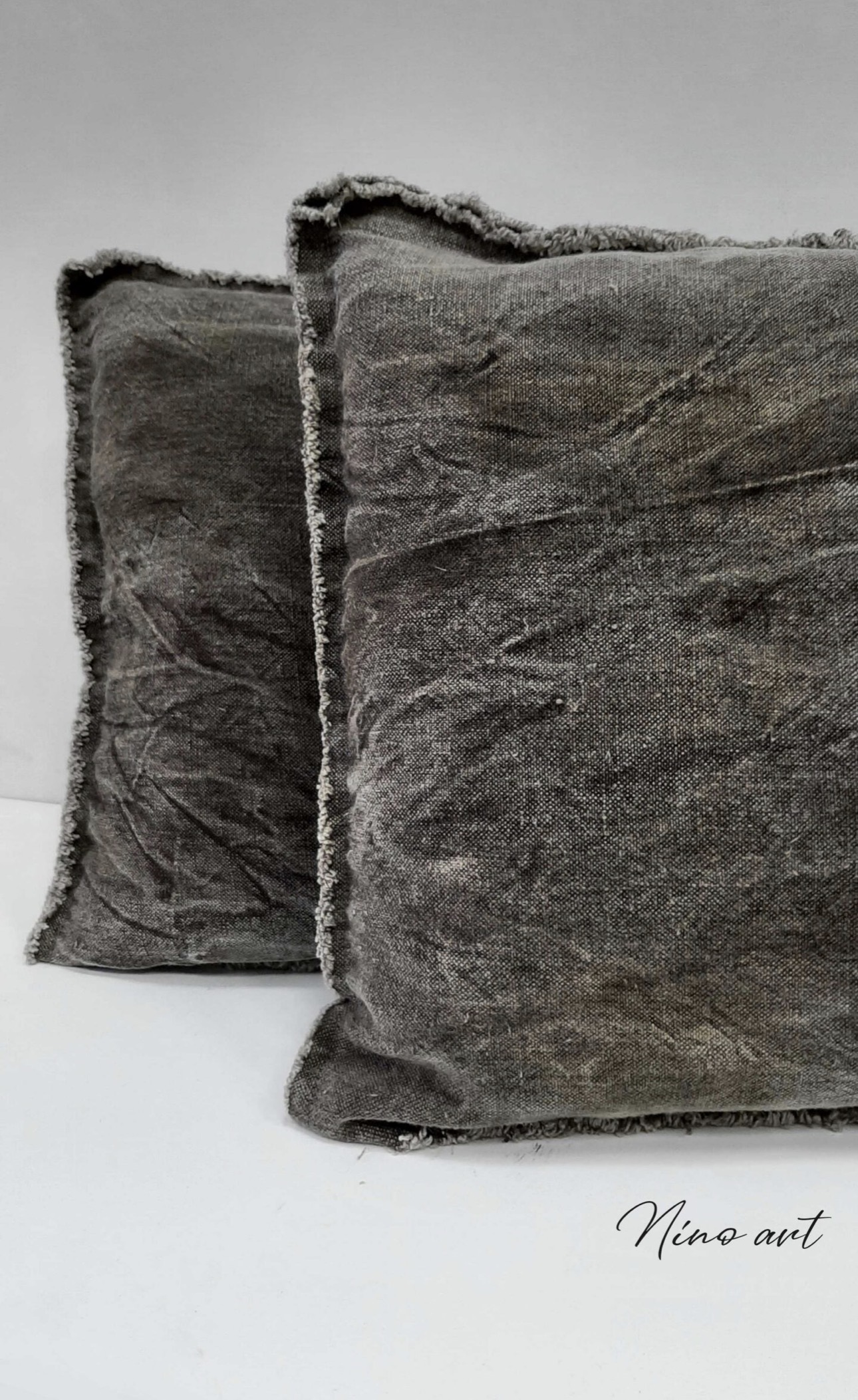 Deze kussens zijn gemaakt van extra zwaar sleets 885 grams linnen en hebben precies die rauwe, pure uitstraling die je niet terug ziet in de massaproducten. Het linnen is met de hand geverfd, waardoor de kleur bewust onregelmatig is.