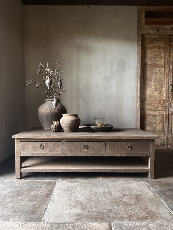 Deze robuuste oud houten Driftwood salontafel heeft aan beide kanten 3 lades, dus 6 lades totaal én een onderblad.