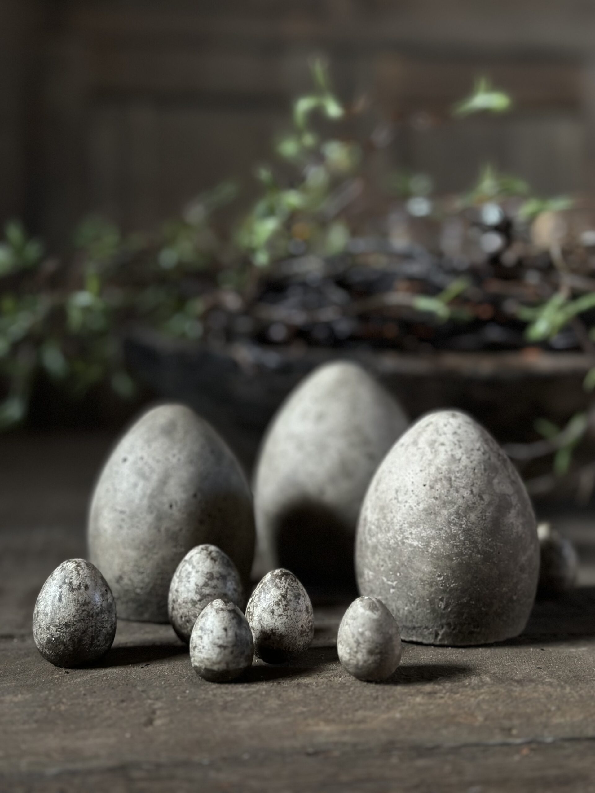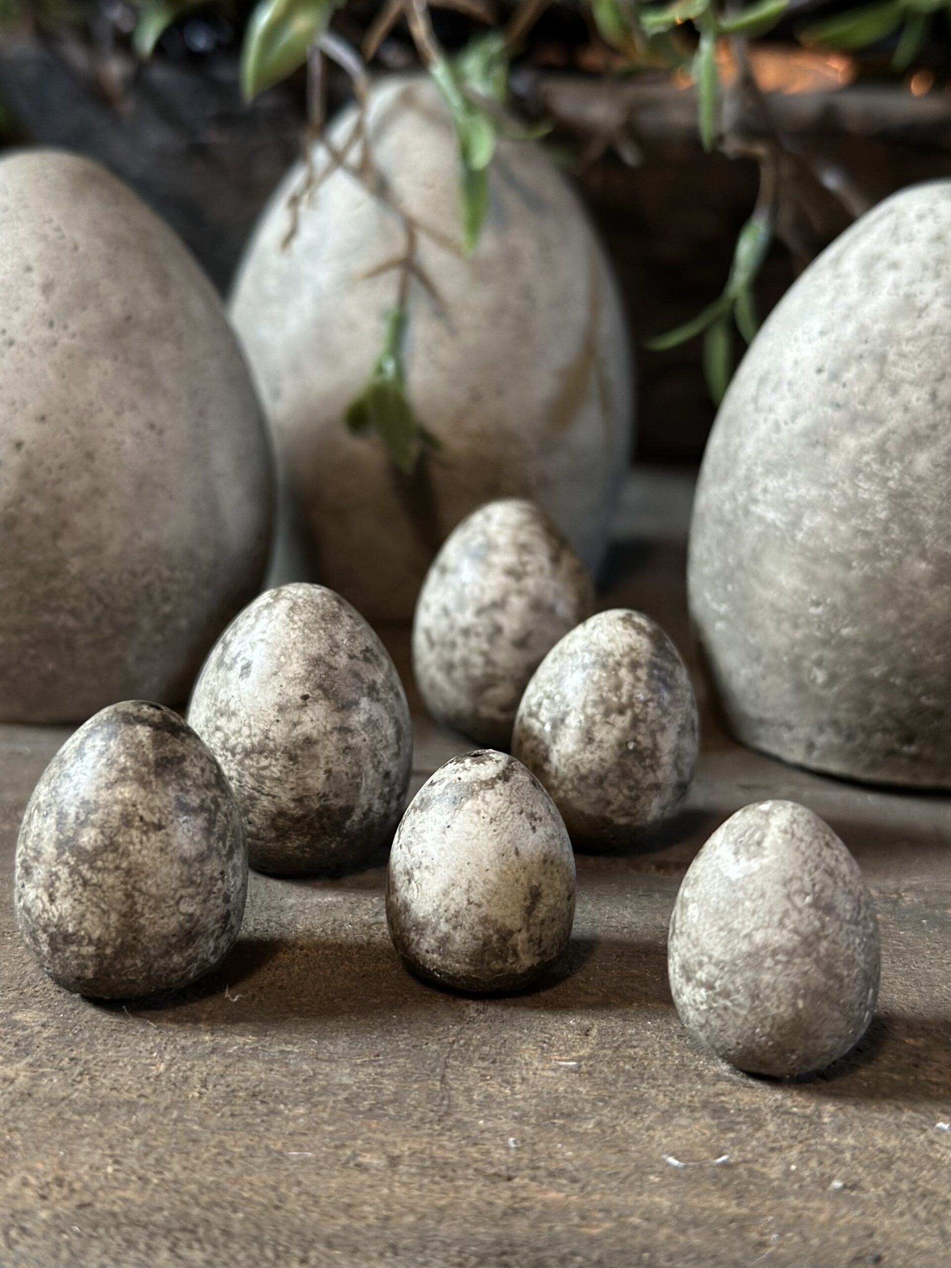 Deze set bestaat uit 6 kleine betonnen eitjes in verschillende afmetingen. Zo bij elkaar lijken ze op kwarteleitjes.
