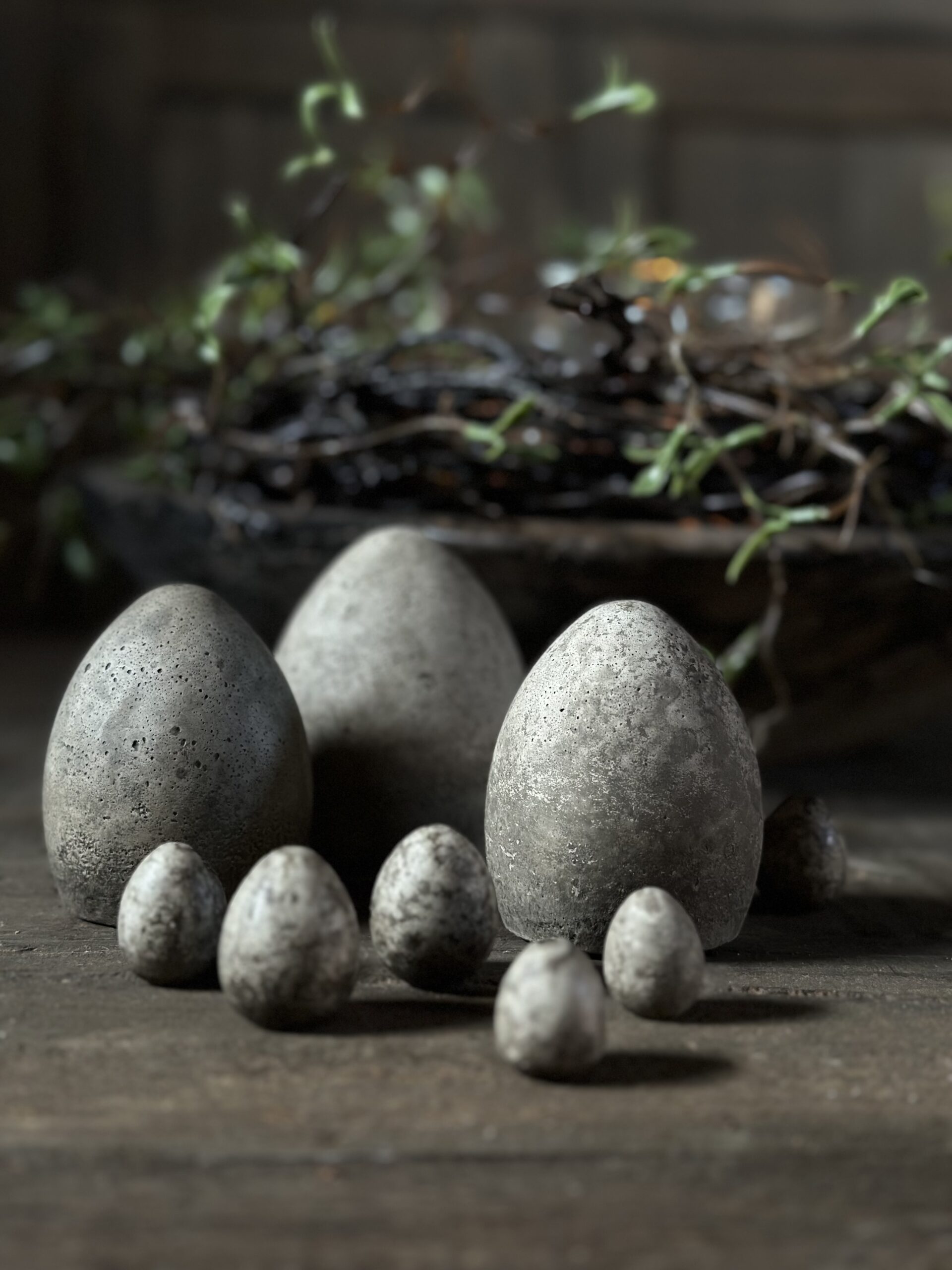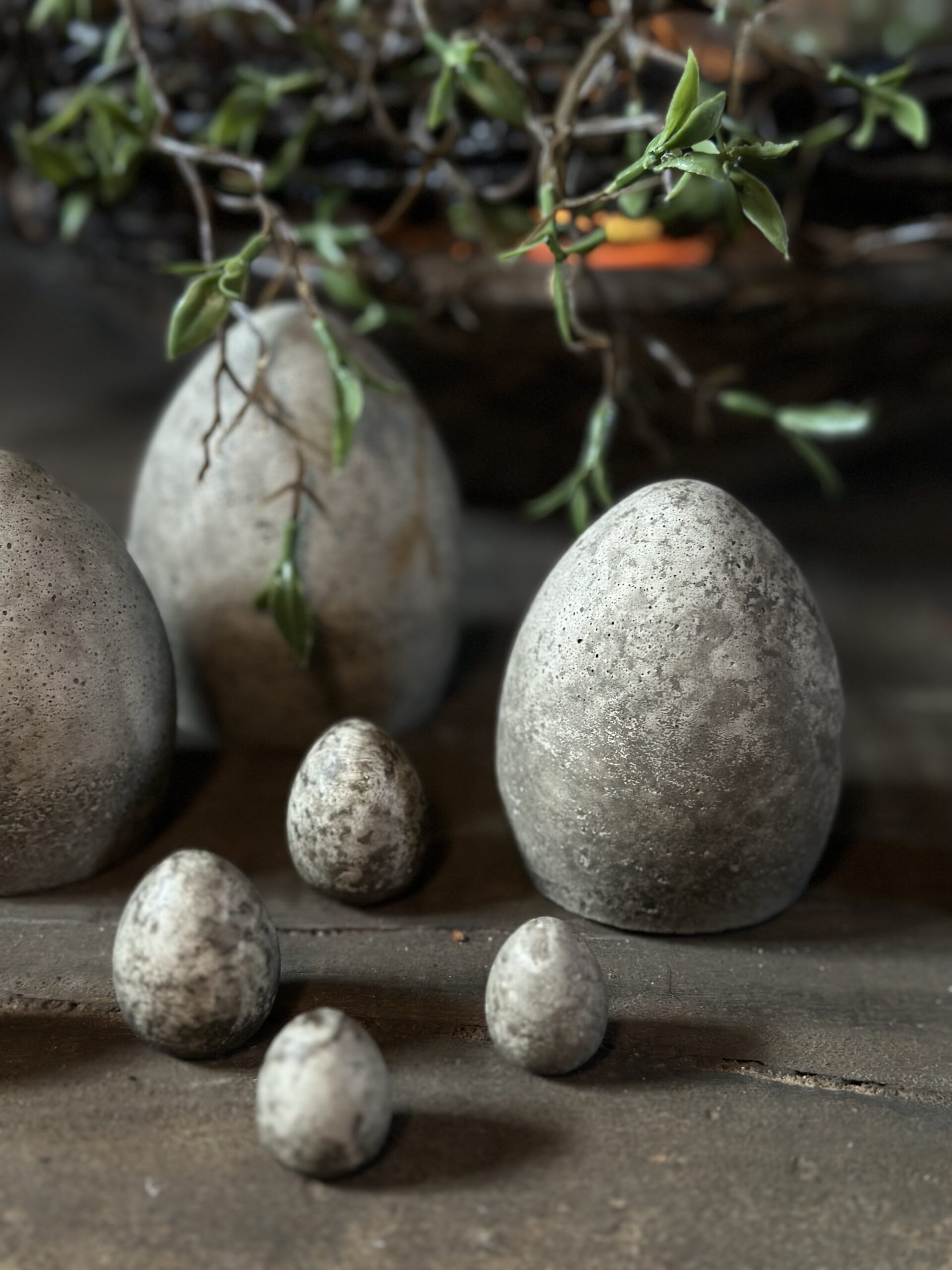 8 cm, 9 cm en een setje van 6 kleine betonnen eitjes in een sobere vergrijsde tint.
