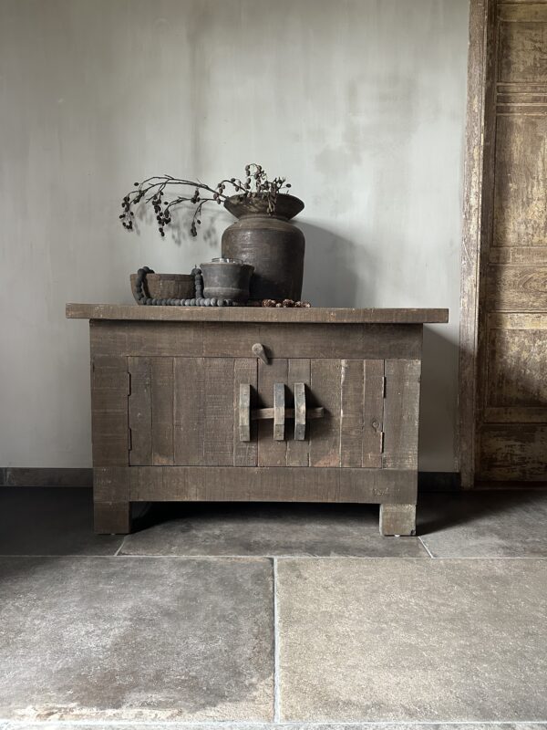 Door het gebruik van oud hout past dit meubel perfect in een landelijk, stoer of sober interieur.