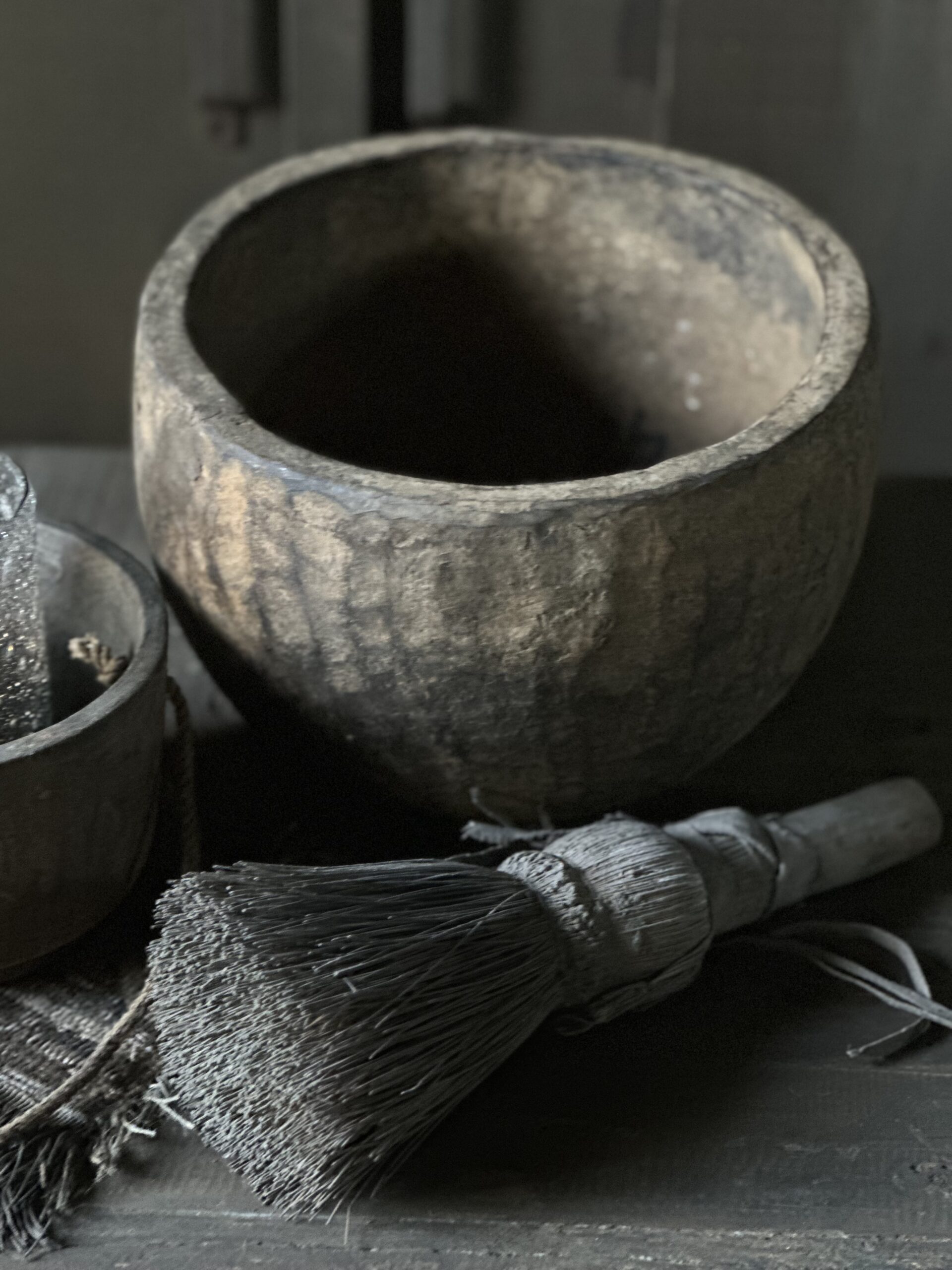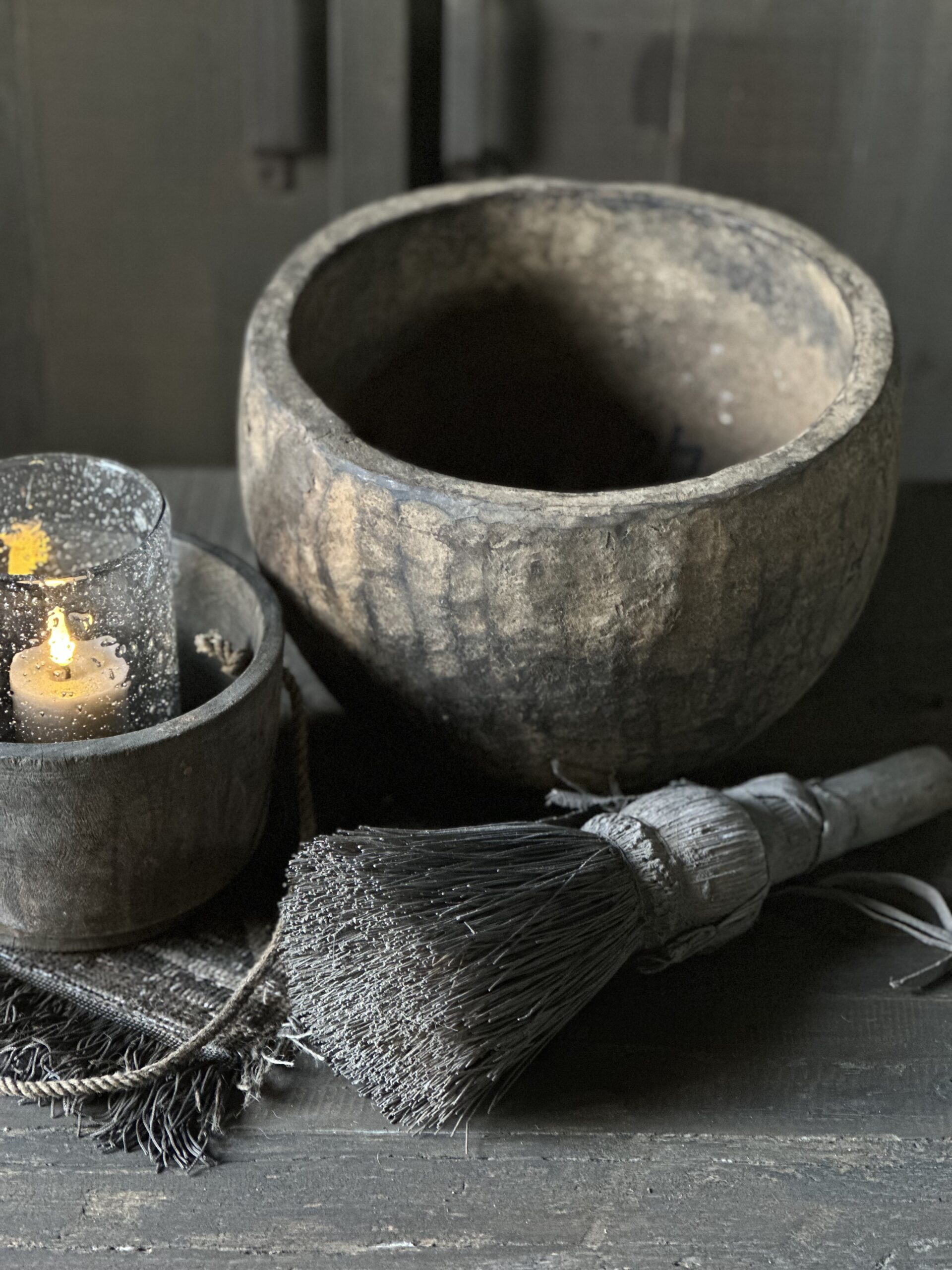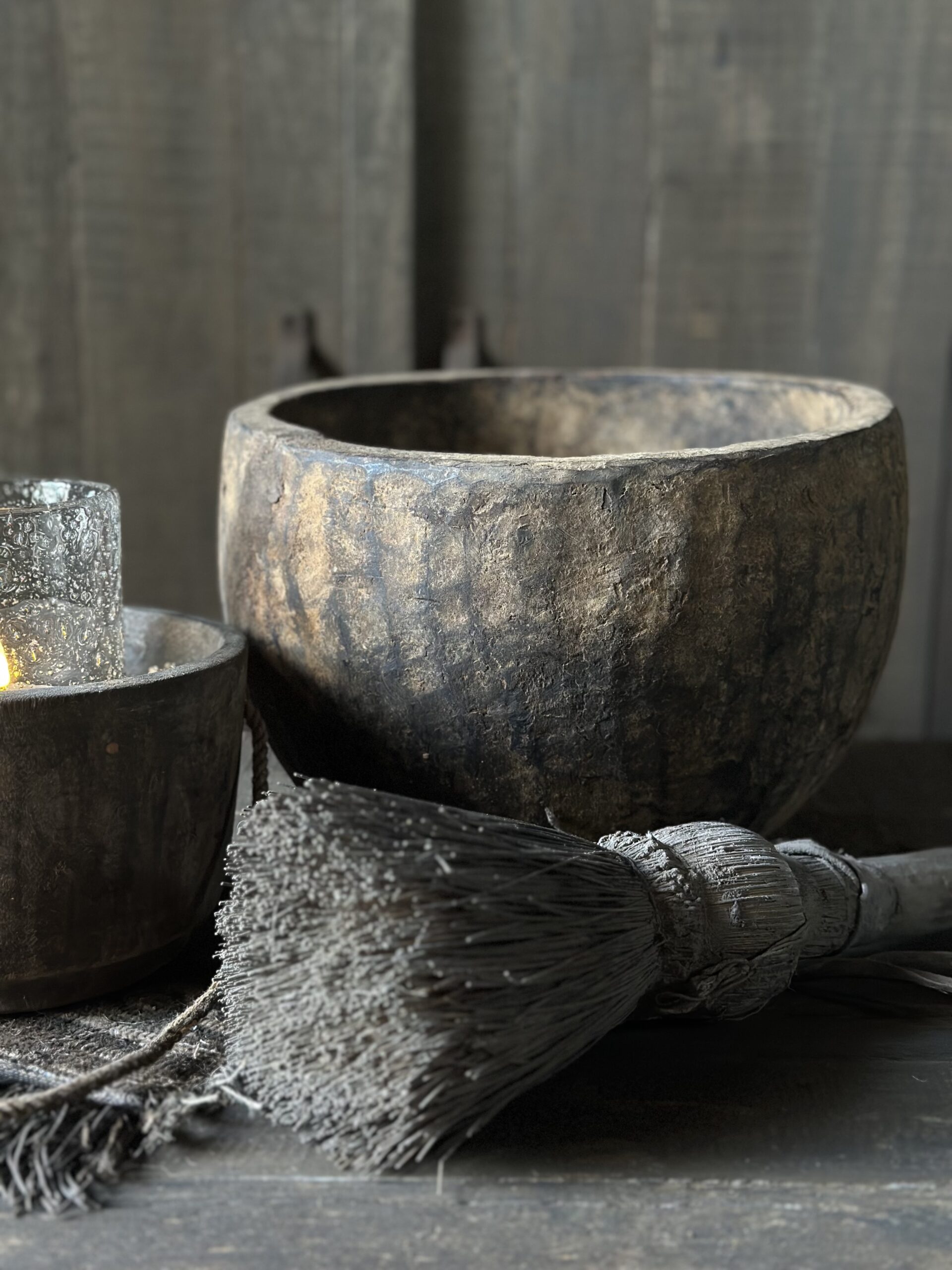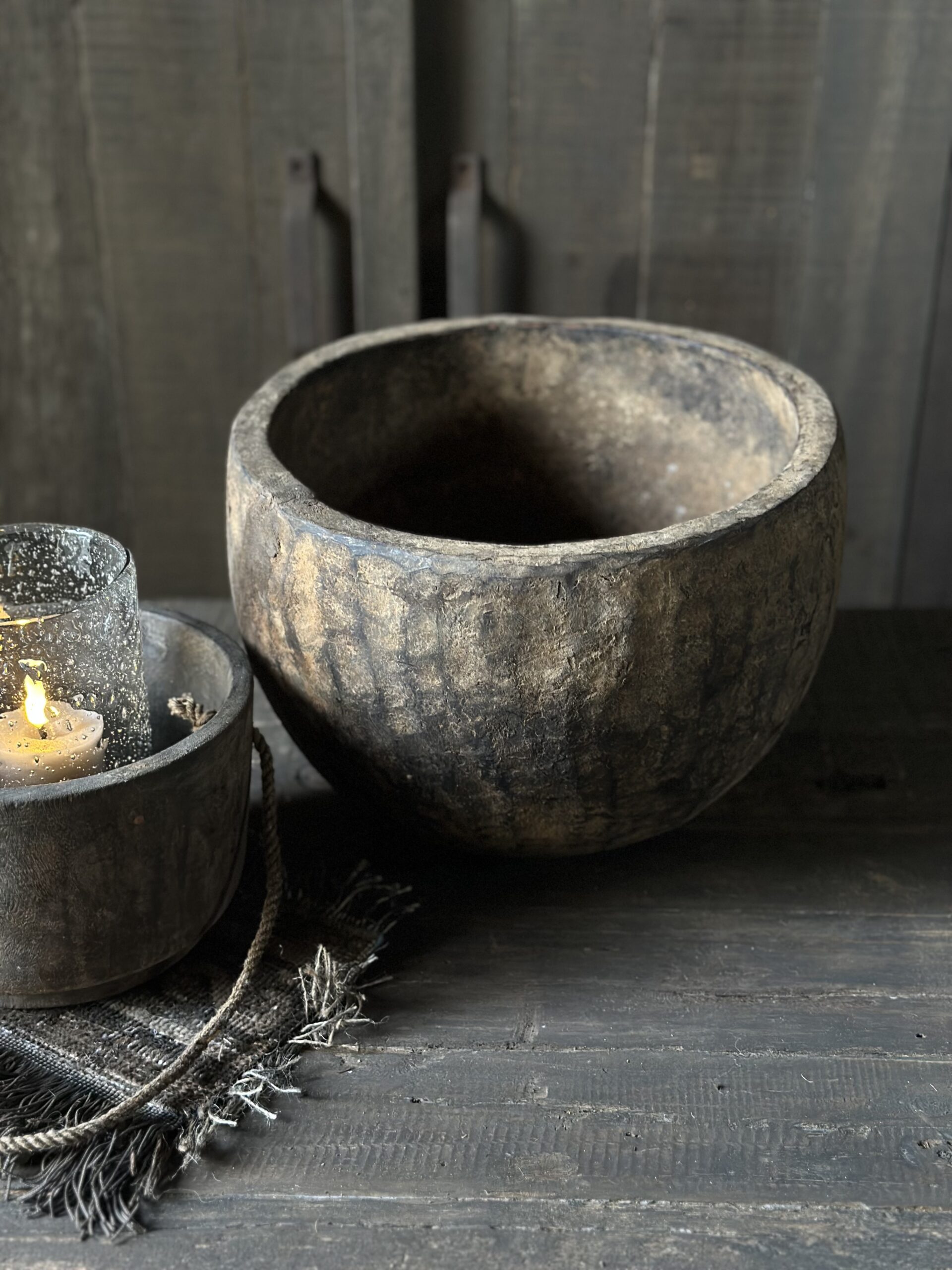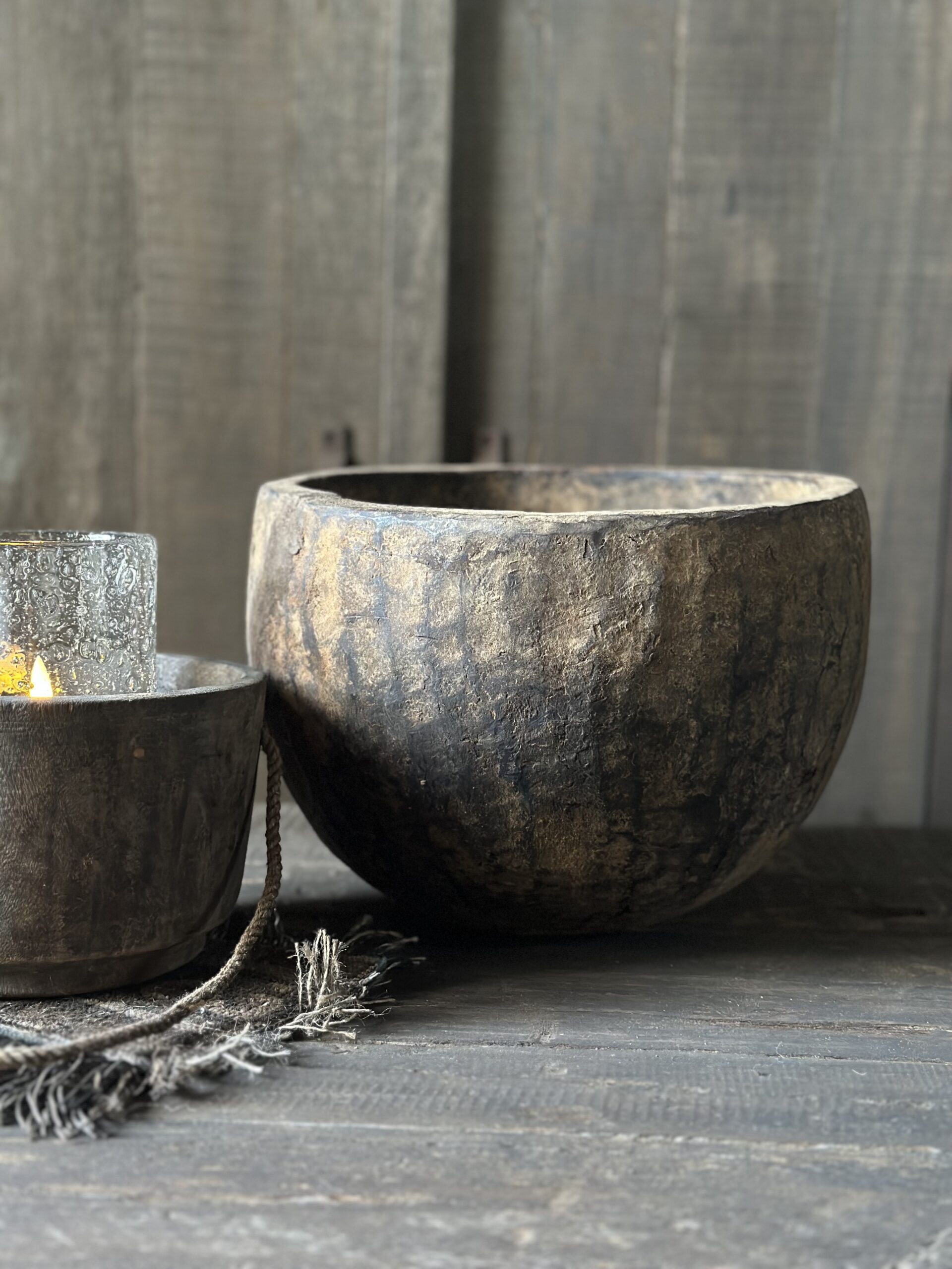 Stoere en sobere oude houten kom uit India.