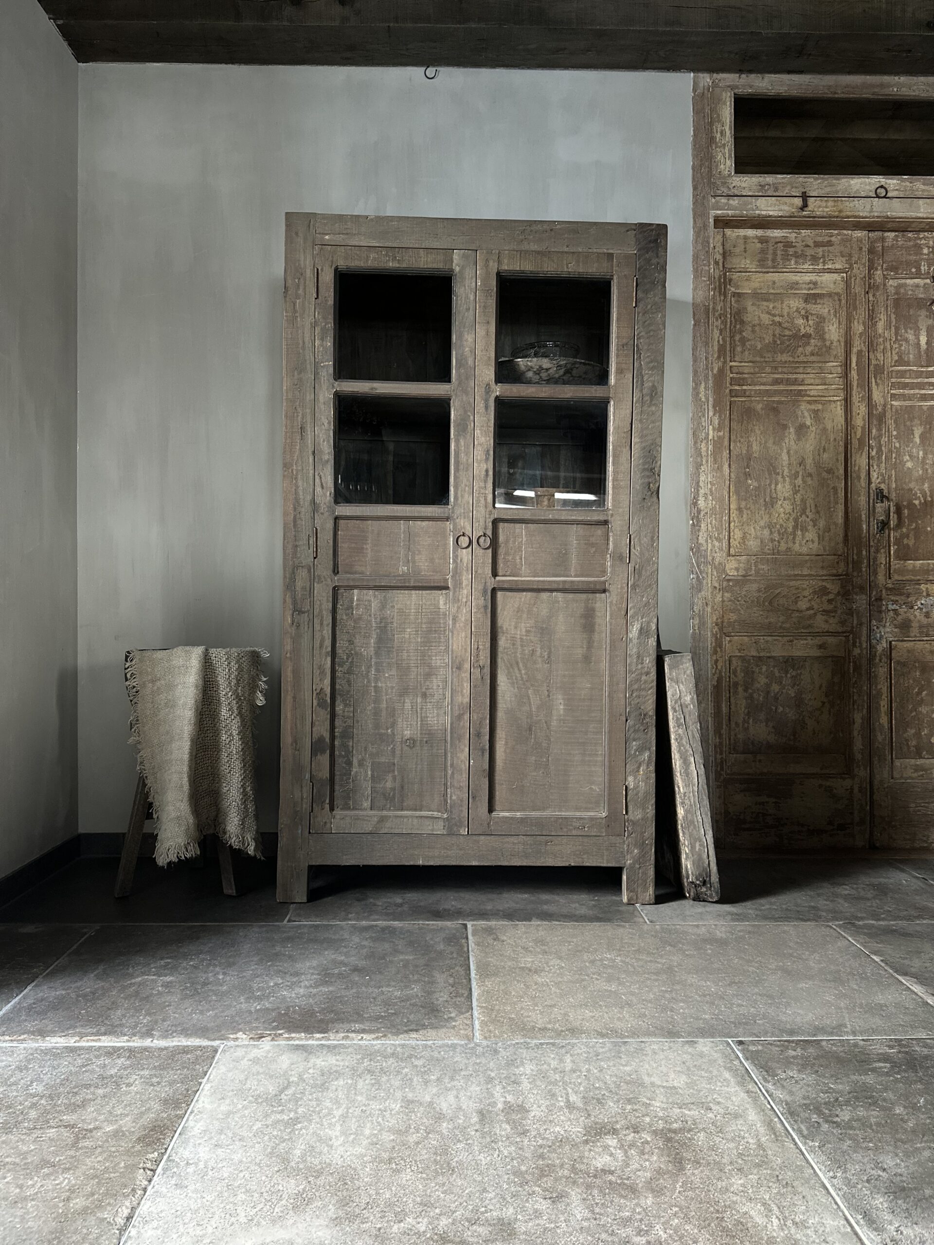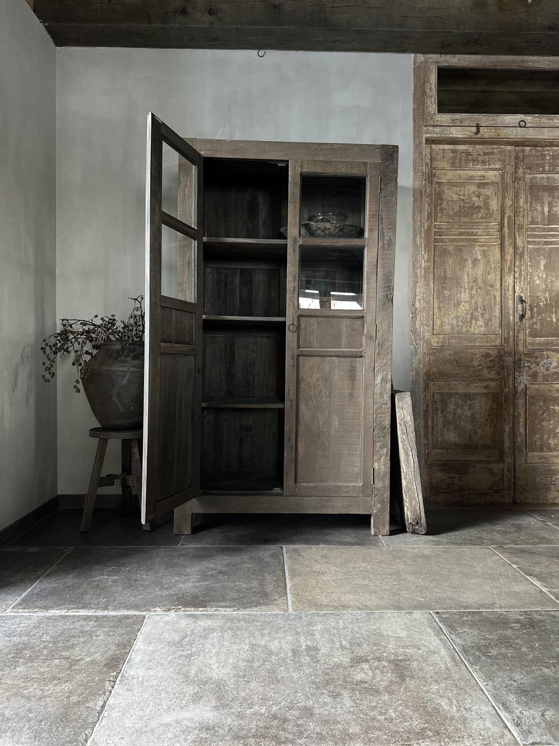 Vitrinekast met 2 deuren. Het bovenste gedeelte van de deuren is voorzien van glas.